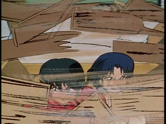 Season 2 Ep 10: Danger at the Tendo Dojo! 17:34 Akane was trying to defend the Tendo Dojo by herself while Ranma was off on a date with Shampoo (in order to get a pouch of powder that is essence of Nanichuan - thinking it will cure him of the curse). Ranma couldn't help himself and came to help her out (because he knew she'd be in trouble he said). Akane was getting beat, and Ranma just stepped in and got smacked against the wall. Akane came over to check if he was okay, when the attacker began again by throwing a barrage of dojo signs. The boards are actually a split second earlier than the cel, and there's a C layer of more boards that you can see in the screencaps that obscure my lovely Ranma/Akane moment. Thank goodness for being able to get the cels seperately! I really like this one, even though it's line faded on Ranma's face quite a bit. Fun tidbit: They accidentally painted the area below Ranma's right arm red, and it shows in the screencap! :D Yeah, I still love this hobby! XD (and I got this for just over eight dollars!!!!!)